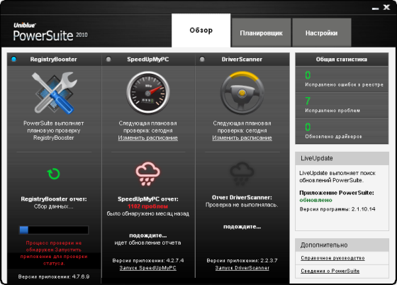Uniblue PowerSuite 2010 - является полным решением для повышения производительности компьютера. Слияние RegistryBooster, DriverScanner и SpeedUpMyPC в рамках единого интерфейса, PowerSuite повышает и защиту уязвимых групп, но очень важных элементов системы привязаны к скорости и стабильности.