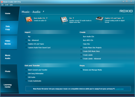 Roxio Creator 2011 Pro представляет собой решение для записи, редактирования и публикации персональных видеоматериалов, включая записи высокой четкости. Приложение обеспечивает запись дисков, резервное копирование данных, преобразование записей с разных носителей в формат MP3, редактирование аудиозаписей, создание меню для DVD, поддержку стандарта Blu-ray и высокую скорость кодирования видеопотока благодаря применению технологий ATI Stream и NVIDIA CUDA.