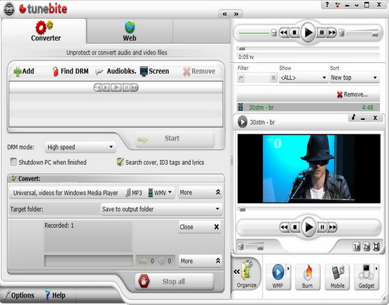 Tunebite - программа, позволяет делать копии с музыкальных файлов, защищенных от копирования. Применяемые технологии цифрового управления авторскими правами (DRM) не дают возможности ни конвертировать их в MP3, ни записывать на компакт-диск, ни проигрывать где-либо, кроме того компьютера, на который этот файл был закачан. Программа позволяет записывать всё, что бы вы ни закачали на компьютер в защищённых цифровых форматах. Возиться с настройками этой программы не нужно, она автоматически определит необходимые для записи параметры звуковой карты. Кроме всего перечисленного, данная программа позволяет записывать защищенное аудио и видео на CD/DVD, изготавливать рингтоны для мобильных телефонов и переносить файлы на мобильные устройства.
