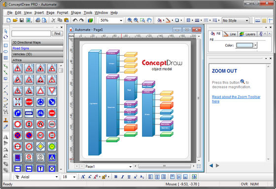 ConceptDraw Pro предназначен для профессионального создания диаграмм, схем, планов помещений и иллюстрирования. ConceptDraw гибкий и удобный инструмент, который позволит быстро задокументировать множество разных структур, систем и процессов. Готовые документы могут быть представлены как CAD-файлы, графические файлы, презентации или веб-страницы. В помощь программа имеет множество библиотек (инженерные изображения, диаграммы компьютерных сетей, научные иллюстрации, организационные диаграммы, бизнес процессы, строительство, планы помещений, промышленное оборудование, карты веб-сайтов и др.) уже готовых объектов.