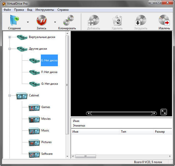 • Прожиг CD и DVD с любыми данными, музыкой, играми, записанными на виртуальных дисков