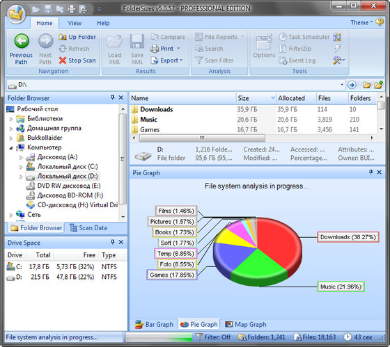 Эта программа позволит вам провести проверку жестких дисков на наличие на них свободного места. Если вы никак не можете понять, почему места осталось так мало, запустите FolderSizes Pro, и программа создаст для вас полный отчет. Программа сгенерирует диаграммы, которые наглядно покажет, какие папки занимают больше всего места. Среди возможностей программы: Распечатка отчетов, экспорт их в HTML; Экспорт диаграмм в файлы JPEG, PNG, BMP или TIFF; Система создания отчетов по типам файлов, которые занимают больше всего места.