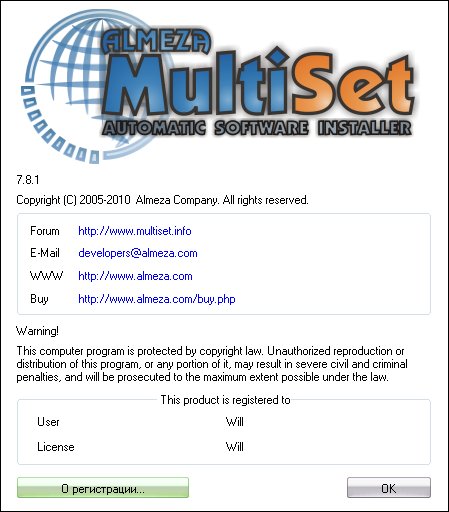 Almeza MultiSet - автоматический установщик программ и Windows. Хотите создать инсталляционный диск WindowsXP, который бы автоматически устанавливал систему, не задавая вопросов про имя пользователя, ключ продукта, временные и региональные настройки? При этом автоматически устанавливаются ваши любимые приложения, прописываются нужные ключи реестра, обновляются драйвера, ставятся новые заплатки (сервис паки) от ОС. Все это возможно и просто сделать с помощью программы Almeza MultiSet. С помощью программы MultiSet можно создать автономный - загрузочный диск для автоматической установки программ и ОС Windows с любого носителя информации (CD/DVD/Flash/Hard Drive) на любое количество компьютеров.