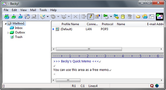 Becky! Internet Mail - это почтовая программа с умением создавать HTML-письма, с возможностью приема почты по POP3 и IMAP4 протоколам, с шаблонами и макросами для автоматизации работы с почтой, с возможностью создания нескольких профилей для одного почтового ящика, со способностью напоминать о событиях и автоматически отправлять в назначенный срок поздравления юбилярам, включает встроенное PGP-шифрование, создание аудиописем, менеджер листов подписок и мощные возможности по сортировке писем.