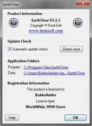 EarthTime - программа для показа локального времени и даты любого места земного шара. Программа имеет встроенную базу данных более 3000 городов Земли, а также позволяет пользователю добавлять любое количество собственных локаций. Позволяет устанавливать будильники на любое локальное время любого города нашей планеты. Множество опций в данной программе предоставляют пользователю гибкие настройки часовых поясов и локального времени.