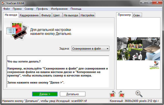 VueScan Pro - программа для работы со сканерами HP, Minolta, Nikon, Polaroid, Epson, Canon и другими. Может работать с внутренней глубиной цвета. VueScan поддерживает автоматическую и ручную настройку большинства параметров и пакетный режим сканирования. Поддерживается более 500 моделей сканеров с определенным перевесом в сторону слайд-сканеров — Nikon, Minolta, Polaroid, Microtek, Epson. Предусмотрено автоматическое удаление дефектов изображения за счет канала инфракрасного сканирования и многопроходное сканирование с последующим усреднением результата — для подавления собственных шумов сканера. Имеются фильтры подавления зерна, нерезкого маскирования и удаления паразитного оттенка оригинала. Есть средства ручной корректировки динамического диапазона и градационной характеристики (независимо по каналам R, G, B).