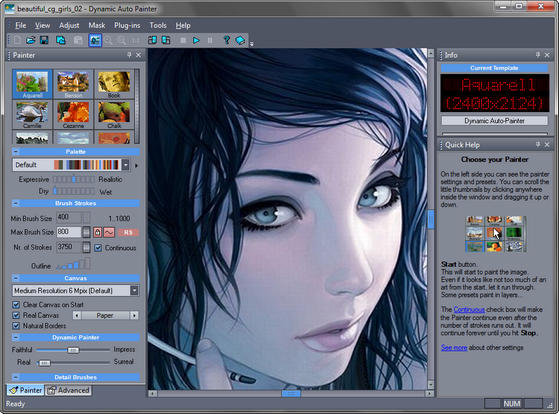 Dynamic Auto-Painter - это большой шаг вперед в автоматической живописи. Это уникальная программа, которая позволяет превратить ваши фотографии в картины, используя имитацию техники рисования самых знаменитых художников планеты. В отличие от других аналогичных инструментов и эффектов, Dynamic Auto-Painter не изменяет саму фотографию, он просто использует изображение в качестве оригинала, с которого автоматически рисует новое изображение, используя соответствующие кисти и стили. При этом вы можете наблюдать за работой программы, как за работой настоящего художника.