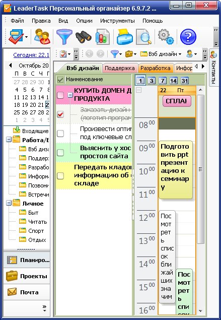 LeaderTask - это умный органайзер для лидеров! Интеллектуальная система управления проектами, событиями, задачами, контактами, освободит вас от рутины и даст больше времени для творчества. LeaderTask поможет вам избавиться от различных поглотителей времени, поможет вам увидеть четкую перспективу жизни, иметь подробный обзор дел, задач, вы будете ставить более высокие цели и достигать их. Кроме того, LeaderTask - это еще и удобный менеджер проектов, с помощью которого можно легко планировать и управлять вашими личными делами, а также бизнес проектами.