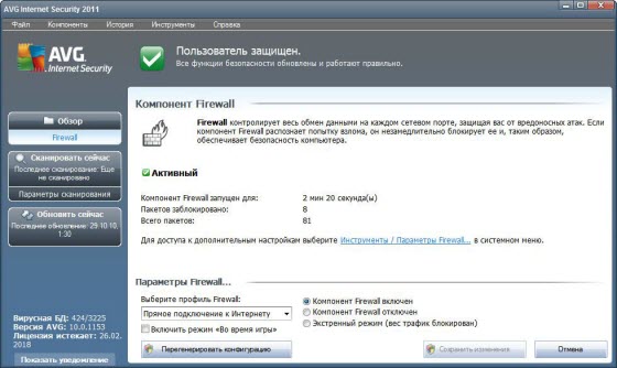 - Контроль за сетевыми соединениями. При помощи встроенного файрволла AVG проверяет все входящие и исходящие запросы на соединение с компьютером, предотвращает сетевые атаки на компьютер, и сетевую активность программ-троянов.