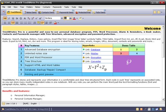 TreeDBNotes Pro - это мощный и очень удобный в работе органайзер с иерархической структурой, который сочетает в себе функции базы данных, органайзера, менеджера контактов и паролей, текстового редактора, речевого процессора, будильника, напоминалки и многого другого. Данная программа идеально подходит для хранения заметок, электронной почты, изображений, ссылок, документов, контактов и паролей.