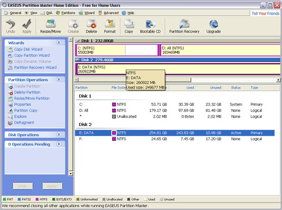 EASEUS Partition Master — удобная программа для разбиения жёсткого диска на разделы, которая не только упростит рутинные задачи, но и поможет вам редактировать разделы диска и управлять ими. А именно — быстро и с лёгкостью создавать, удалять и форматировать разделы, изменяя их размер и расположение без потери данных, с использованием свободного места на диске. С помощью этой программы, вы можете создавать, удалять, форматировать разделы на вашем жестком диске быстро и просто. К наиболее привлекательной функции относится способность изменения размера/перемещение ваших разделов, используя свободное место, без удаления данных.