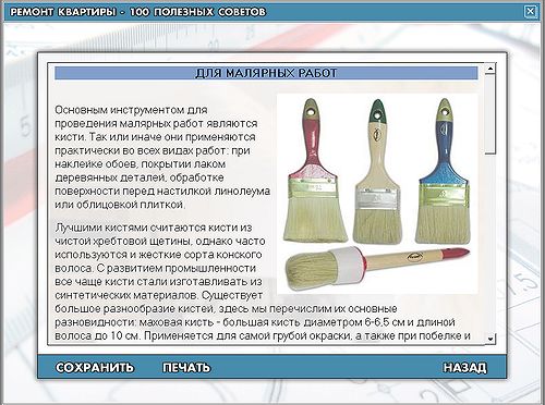 В энциклопедии Вы получите огромное количество профессиональных полезных советов по подготовке и финишной отделке потолков, полов и стен с применением разнообразных материалов и различных технологий. Также здесь Вы найдете множество полезных рекомендаций, с помощью которых вы сможете своими руками приготовить штукатурный раствор, грунтовки и краски, а также узнаете все о необходимых инструментах для успешного ремонта.