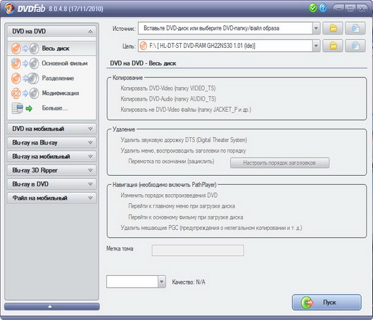 - Копировать на чистый DVD диск любого формата(DVD+R/RW, DVD-R/RW, DVD+R DL, DVD-R DL).