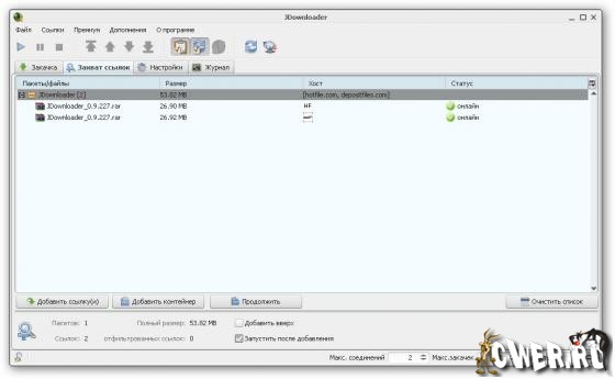 JDownloader - программа для автоматической закачки файлов с сайтов: RapidShare.com, RapidShare.de, Letitbit.net, Depositfiles.com, Filefactory.com, Uploaded.to, Megaupload.com, Megashares.com, Vip-file.com, Upshare.net, Youtube.com, Myvideo.de, Imagefap.com, Files.to и т.д. Во многом аналогична c USDownloader но с более широким функционалом, в отличии от USD данная программа может качать несколько файлов одновременно, группирует ссылки на многотомные архивы - что позволяет качать одновременно с нескольких файлообменников, работает с премиум аккаунтами удобно реализовано переключение между эккаунтами - есть возможность многопоточной закачки с докачкой, имеет встроенный инструмент реконнекта с функцией автоматического определения параметров.