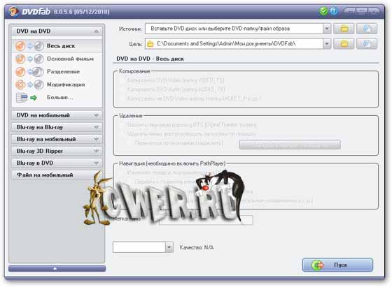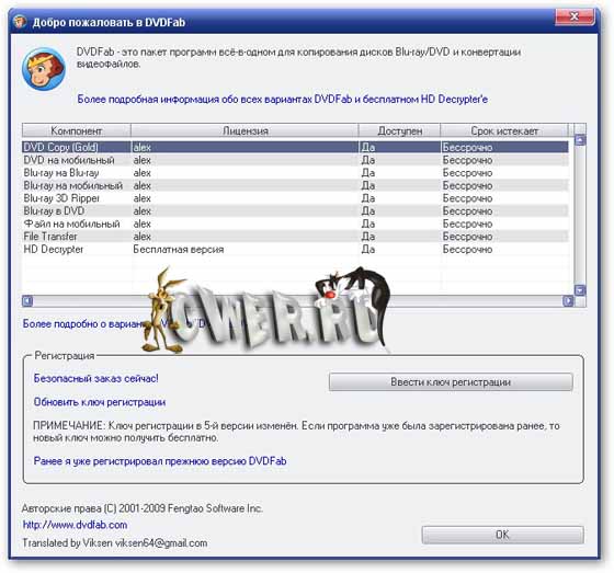 DVDFab – мощный, многофункциональный программный продукт для копирования DVD дисков с возможностями гибкой обработки видеопотока. Программа является одной из лучших на сегодняшний день, из инструментов для копирования, разбиения, пережатия и конвертирования DVD дисков с фильмами. Снимает все защиты и ограничения с диска и при желании пережмет диск большой емкости и вместит его в обыкновенную пустую DVD болванку с минимальными потерями качества (DVD9->DVD5) или разобъет фильм на два диска с полным переносом его меню, удалит всю рекламу, запишет только фильм и многое другое. Программа имеет интуитивно понятный, мультиязычный интерфейс включая русский.