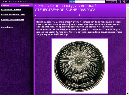 В занимательных фактах, легендах и научной информации представлена хронология событий становления российской экономики, реформ, проведенных величайшими фигурами разных эпох: Еленой Глинской, Алексеем Михайловичем, Петром I, Николаем I... В материалах энциклопедии Вы найдете подробное описание памятных монет Банка России, сможете прикоснуться к миру собирателей старинных денег, познакомиться с основными понятиями нумизматики и другой полезной информацией. Энциклопедия хранит в себе «каталог русских денег», в котором описано более 350 старинных монет и бумажных купюр СССР и России. Иллюстрированное энциклопедическое издание адресовано любителям нумизматики и всем, кто интересуется отечественной историей и культурой. Диск содержит также аудиостатьи.