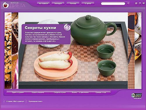 Современная модель японской диеты – это новое слово в правильном питании. Энциклопедия «Японская диета» из серии «Все о диетах» поможет вам погрузиться в загадочный мир Востока, чтобы узнать, как стать красивыми и здоровыми. На диске вы найдете 10 правил японской диеты, 60 рецептов блюд и, конечно же, секреты долголетия японцев. Узнайте, как с помощью здорового питания достичь душевной гармонии!