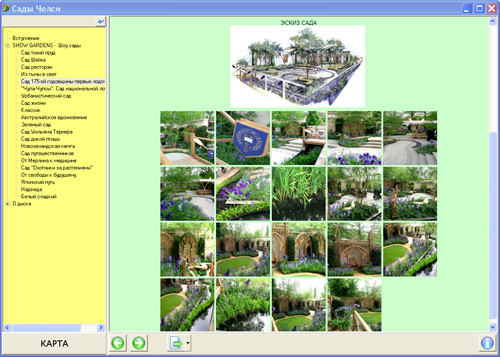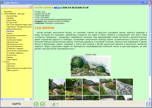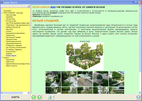 На диске представлено более 300 фотографий, рассказывающих о шоу-садах - самых впечатляющих "экспонатах" знаменитой выставки садового искусства в Челси, на которой были представлены работы дизайнеров со всей планеты, в том числе из Новой Зеландии, Австралии, Японии, России, Южной Африки, Эквадора.