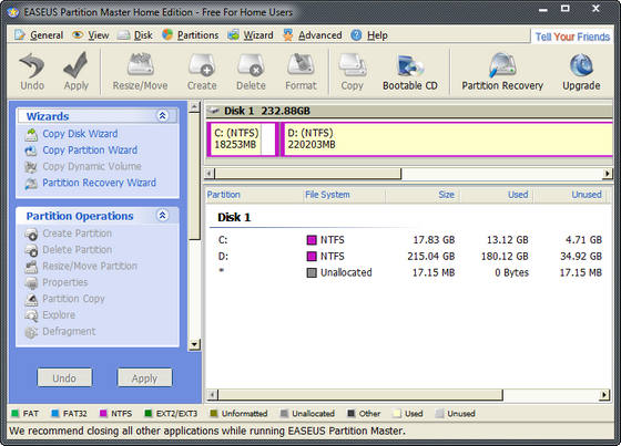 EASEUS Partition Master — удобная программа для разбиения жёсткого диска на разделы, которая не только упростит рутинные задачи, но и поможет вам редактировать разделы диска и управлять ими. А именно — быстро и с лёгкостью создавать, удалять и форматировать разделы, изменяя их размер и расположение без потери данных, с использованием свободного места на диске. С помощью этой программы, вы можете создавать, удалять, форматировать разделы на вашем жестком диске быстро и просто. К наиболее привлекательной функции относится способность изменения размера/перемещение ваших разделов, используя свободное место, без удаления данных.