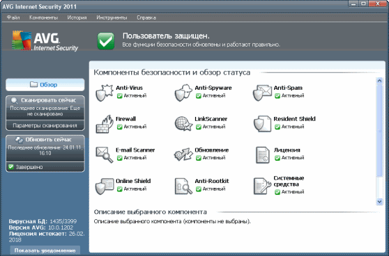 AVG Internet Security - мощный пакет приложений компании GrisоfТ для защиты компьютера от всевозможных сетевых угроз: вирусов, троянов, червей, шпионского и рекламного обеспечений, хакеров и спама. В AVG Internet Security входят модули: Anti-Virus, Anti-Spyware, Anti-Spam и Firewall. Программа легка в использовании, имеет функцию автоматического обновления через Интернет и работы по расписанию. Программа AVG Internet Security 2011 имеет несколько уровней защиты, которые обеспечивают безопасность при совершении покупок, работе с интернет-банком, общении в социальных сетях и просмотре веб-страниц.