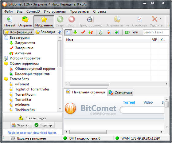 BitComet - это функциональный, быстрый и простой в освоении клиент, который позволяет работать с ссылками формата Bittorrent. Он поддерживает одновременное скачивание нескольких файлов с возможностью установления приоритета загрузки, может создавать очередность загрузки, имеет возможность быстрой остановки/возобновления закачки файлов. Работает с прокси-сервером, может автоматически снижать скорость "отдачи" файлов другим участникам сети Bittorrent, если на компьютере пользователя падает скорость загрузки. Присутствует автоматическая оптимизация настроек соединения для совместной работы с брандмауэром, а также с другими менеджерами загрузки.