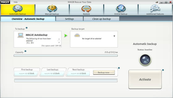 MAGIX Rescue Your Data is a professional application designed to protect your stored data from permanent loss. MAGIX Rescue Your Data automatically creates a full backup of your system files, applications and file hierarchy on a storage medium of your choice, including options and services that allow users to create secure backups online. Simply connect the external hard drive and run a full backup.