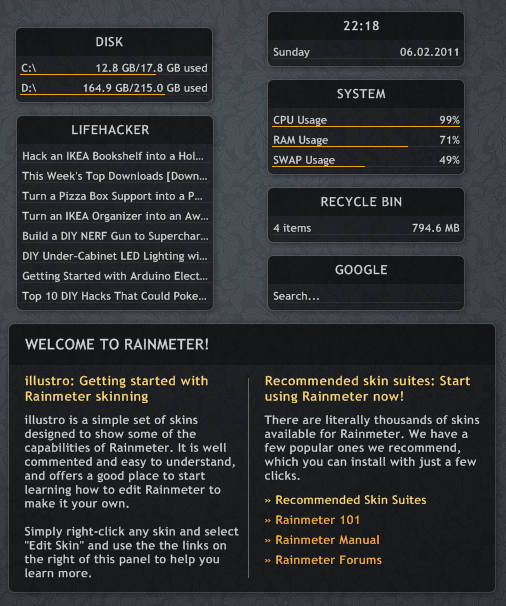 Rainmeter is a desktop customization platform. Through Rainmeter, you can enhance your Windows computer at home or work with skins: handy, compact applets which float freely on your desktop, much like Windows Sidebar gagdgets, or dashboard widgets for the Mac.