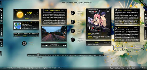 Программа для мониторинга ресурсов компьютера. Данная утилита позволяет отображать: график загрузки центрального процессора, количество свободной и занятой памяти компьютера (оперативной, виртуальной и дисковой). Кроме того, эта программа показывает сетевую информацию, а именно: IP-адрес, DNS-адрес, трафик, скорость использования канала отдельно по каждому из направлений. Также следует отметить такую возможность Rainmeter, как загрузка новостных лент и прогноза погоды. Данное программное обеспечение обладает информативным и приятным пользовательским интерфейсом, который с легкостью вписывается в окружение рабочего стола.