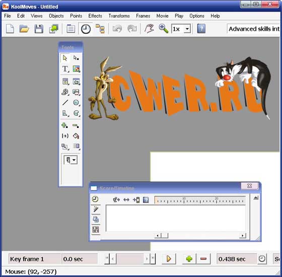 KoolMoves - программа для создания анимационных эффектов в формате Macromedia Flash (.SWF) и кадров для анимированных GIF-файлов и анимации в других популярных форматах. В программе имеется: инструментарий для рисования объектов различной формы, импорт векторной графики, добавление звуковых файлов, множество различных эффектов, в том числе текстовые эффекты, добавление действий к тексту и кадрам. Программа также имеет готовые шаблоны, библиотеку кнопок и векторных заготовок.