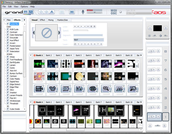 Для смешивания так же будет поставляться обновленная библиотека эффектов и большой набор автоматизированных видео генераторов. GrandVJ обеспечивает поддержку большого количество популярных видео и фото форматов, Flash текстов и анимации. А так же работу с несколькими камерами.