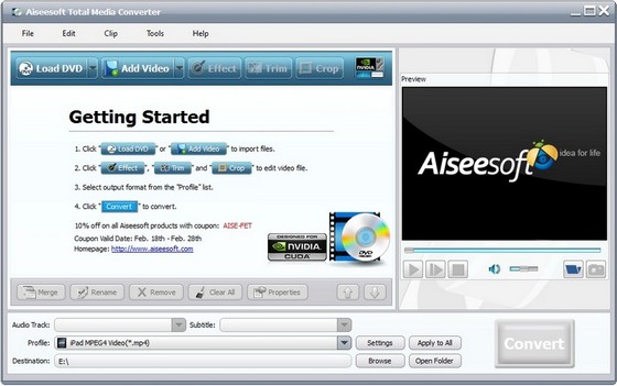 Aiseesoft Total Media Converter - приложение все-в-одном для конвертации аудио/видео файлов, а также DVD в любые аудио/видео форматы, такие как MPEG, AVI, MOV, FLV, SWF, MP3, AAC и другие для проигрывания на Apple iPod, iPhone, iPad и других популярных устройствах.