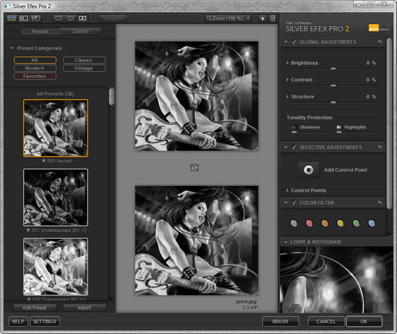 Silver Efex Pro — плагин для Adobe Photoshop позволяющий фотохудожникам выполнять стилизацию современных цифровых изображений под стильные черно-белые снимки. После преобразования цветного изображения в черно-белое в автоматическом режиме, плагин Silver Efex Pro позволяет выполнить более тонкую настройку: предлогает Вам выбрать из 20 готовых стилей, воспользоваться фильтрами цветности и другими инструментами. В распоряжении пользователя также окажется специальный механизм для регулирования зернистости изображения. Плагин использует целый ряд алгоритмов обработки изображения, которые позволят предотвратить появление нежелательных артефактов.
