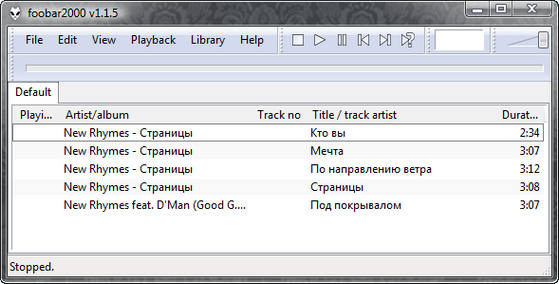 foobar2000 - аудиоплеер, основные черты которого качественный звук, широкие возможности настройки, спартанский интерфейс и низкие системные требования. Foobar проигрывает файлы форматов MP1, MP2, MP3, MP4, MPC, AAC, Ogg Vorbis, FLAC / Ogg FLAC, WavPack, WAV, AIFF, AU, SND, CDDA, WMA (lheubt форматы могут поддерживаться при установке соответствующих плагинов). Имеется полная поддержка unicode. В программе использован новый формат плейлистов (m3u8) и поддерживается чтение APEv2-тэгов из файлов MP3 (id3v2 не поддерживается).