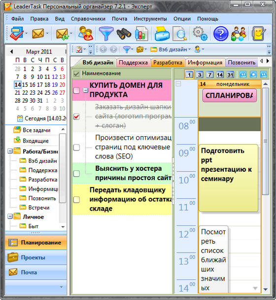 LeaderTask - это умный органайзер для лидеров! Интеллектуальная система управления проектами, событиями, задачами, контактами, освободит вас от рутины и даст больше времени для творчества. LeaderTask поможет вам избавиться от различных поглотителей времени, поможет вам увидеть четкую перспективу жизни, иметь подробный обзор дел, задач, вы будете ставить более высокие цели и достигать их. Кроме того, LeaderTask - это еще и удобный менеджер проектов, с помощью которого можно легко планировать и управлять вашими личными делами, а также бизнес проектами.