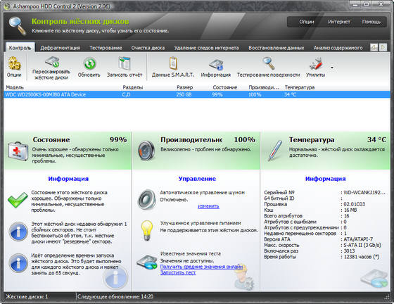 Ashampoo HDD Control - программное обеспечение для контроля за состоянием жестких дисков. Выполняет обслуживание жесткого диска для Вас. Позволяет предотвратить потенциальные отказы и аварии прежде, чем они произойдут. Программное обеспечение поддерживает жёсткие диски типа IDE и последовательные ATA. Ashampoo HDD Control предоставляет пользователю все важные факты и информацию о дисководе, включая регистрационный номер, версию БИОСА (прошивки), размер кэша, количество разделов, на которые разбит хард, свободном месте на диске и текущей температуре.