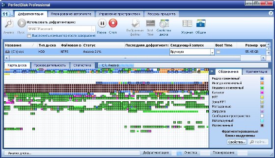 Данные в этой таблице отображаются в виде разноцветных квадратиков, расшифровку цвета которых можно посмотреть в главном окне PerfectDisk. Стоит отметить довольно быструю работу утилиты. Это связано с тем, что используется однопроходный метод дефрагментации с учётом S.M.A.R.T. данных винчестера. Может дефрагментировать не только локальные диски, но и с сетевые, причем в этом случае для облегчения настройки заданий используются профили сетевого планирования дефрагментации и полностью настраиваемое протоколирование работы. Поддерживаются работа с RAID-томами.