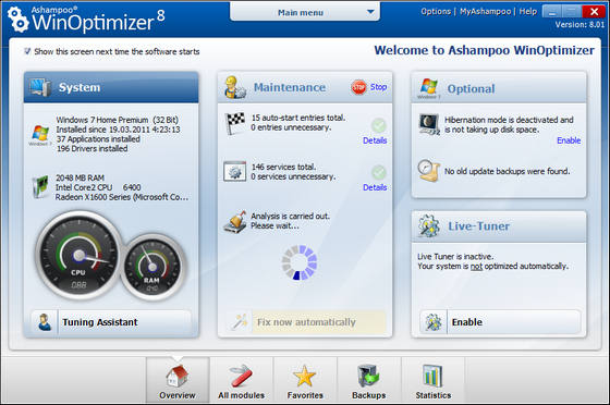 Ashampoo WinOptimizer - новая 8ая линейка пакета программ, позволяющего оптимизировать операционную систему за счет ее настройки и очистки. Включает в себя утилиты для очистки жесткого диска и системного реестра, модуль для обеспечения защиты личной информации путем поиска и удаления файлов и данных, оставшихся после интернет-cepфингa, утилиту для оптимизации интернет-соединения, модуль для настройки программ, автозагружаемых одновременно с запуском системы, а также модули для поиска и удаления ненужных файлов DLL, для безвозвратного удаления данных и для шифрования файлов. Кроме этого, программа позволяет переназначать ассоциации файлов, шифровать и расшифровывать файлы, а также безвозвратно их удалять. Наконец, возможна настройка параметров системы и ее оптимизация за один клик. В шестой версии программы появилось немало новых возможностей, новые модули, включая новый антишпионский модуль и менеджер контекстного меню Windows, а также множество улучшений и исправлений.