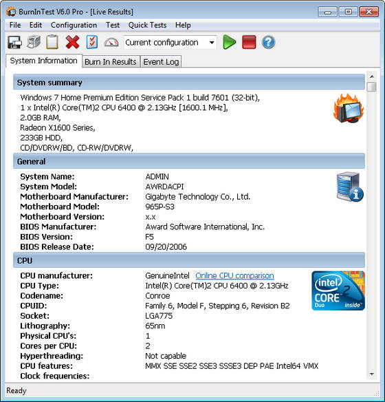 BurnInTest Professional - профессиональная версия программы для всестороннего и детального тестирования компонентов компьютера. Утилита тестирует скорость процессора, оперативную память, жесткие диски, CD/DVD приводы, звуковые карты, видеокарты, принтеры, сетевые соединения. BurnInTest Professional также может проводить тестирование последовательных (до 12 портов одновременно) и параллельных портов, портов USB (до 10 портов одновременно). Также в профессиональной версии имеются дополнительные параметры тестирования процессоров и видеокарт. После тестирования программа выдает отчет с найденными ошибками и нестабильностями. Идеально подходит для любителей разгона.