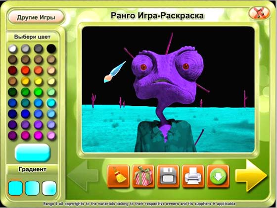 Проявите ваши художественные способности и раскрасьте Ранго и все, что его окружает. Ваши шедевры вы можете распечатать и подарить вашим друзьям и близким. Эта игра подарит вам море замечательного времяпровождения и непременно поднимет вам настроение. А если у вас получилась иллюстрация вашей мечты, вы сможете ее распечатать и получить разноцветный постер с Ранго или применить ее в качестве обоев для рабочего стола.