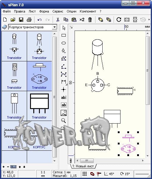 Графический редактор с элементами, позволяющими легко рисовать электрические схемы. Очень простой и интуитивно понятный интерфейс. Может использоваться как текстовый редактор, легко составляются таблицы. Для рисования электрических схем имеется несколько библиотек, элементы которых могут легко редактироваться и добавляться, есть функция автоматической нумерации элементов, привязка линий к выводам элементов, группировка элементов, привязка к сетке. Возможность рисования линий под определенным углом, поворот элементов, вставка рисунка, экспорт в форматы jpg, bmp. Удобный вывод на печать.