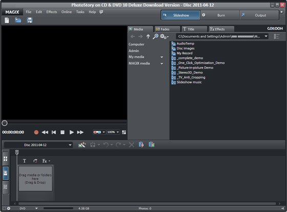 Magix PhotoStory on CD & DVD Deluxe - программа для записи коллекции фотографий на CD и DVD диски для их последующего просмотра на экране вашего телевизора. Программа позволит вам преобразовывать ваши фотографии и видео в незабываемые слайдшоу с потрясающими переходами, звуковым сопровождением и т.д. Вы сможете добавлять на фотографии и видео различные эффекты, переходы, профессиональные фильтры, заголовки, музыку и многое другое. Создание слайдшоу происходит всего за несколько нетрудных шагов. Сначала вы должны импортировать фотографии и видео, после чего отредактировать их, накладывая эффекты, текст, переходы и фильтры, и в заключение записать готовый результат на CD или DVD диск. Программа содержит в себе различные шаблоны для быстрого создания ваших проектов.