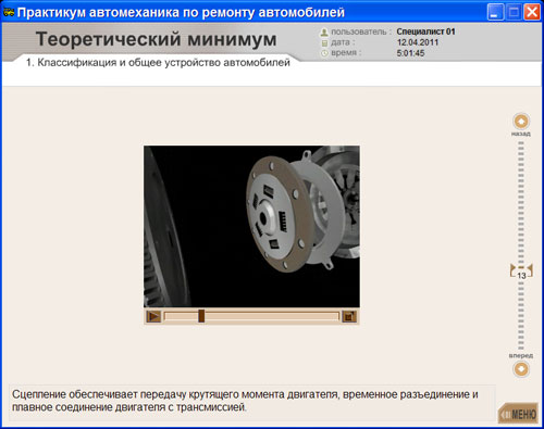 Информация представлена в виде логической последовательности мультимедийных компонентов: 15 фрагментов трехмерной анимации, 60 минут высококачественных видеофрагментов, 250 фрагментов флэш-анимации, 500 иллюстраций, 700 тестовых заданий, 450 страниц текста.