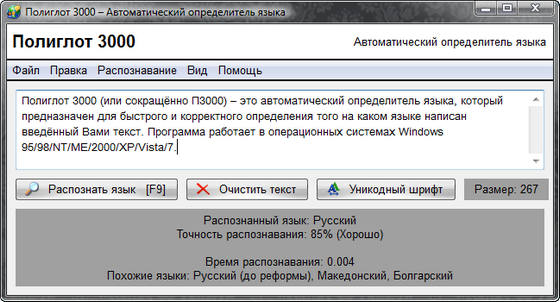 Полиглот 3000 (или сокращённо П3000) – это автоматический определитель языка, который предназначен для быстрого и корректного определения того на каком языке написан введённый Вами текст. Программа работает в операционных системах Windows 95/98/NT/ME/2000/XP/Vista/7.