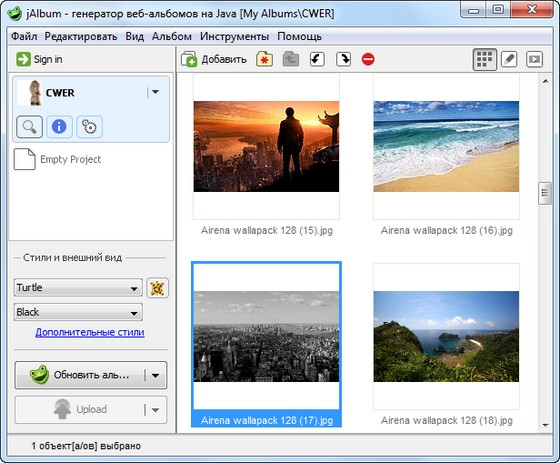 Jalbum - программа для автоматического создания веб-галерей. Для этого достаточно мышкой перетащить в окно программы папку с картинками, и она сгенерирует галерею с уменьшенными копиями изображений (или Slide-Show вариант). Впрочем, возможен и ручной режим работы с полным контролем над создаваемым проектом, в том числе с использованием имеющихся фильтров изображений, настройкой стилей, использованием данных IPTC/EXIF и т.п.