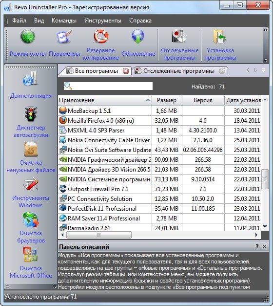 Revo Uninstaller Pro - программа для удаления нежелательных приложений, установленных на вашем компьютере. Имеет продвинутый алгоритм сканирования системы до и после инсталляции и позволяет удалять оставшиеся после деинсталляции программы файлы, папки и ключи реестра. Уникальный "режим охотника" предлагает простые, но эффективные инструменты для управления (деинсталляция, остановка, удаление, отмена автозапуска) и получения информации об инсталлированных и/или запущенных программах. Revo Uninstaller также предлагает еще 8 различных утилит для очистки системы.