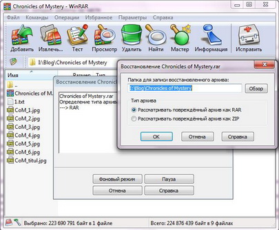 - Запустите WinRAR - "Операции" - "Восстановить архив(ы)" - "ОК". Дальше действуйте согласно предложениям WinRAR.