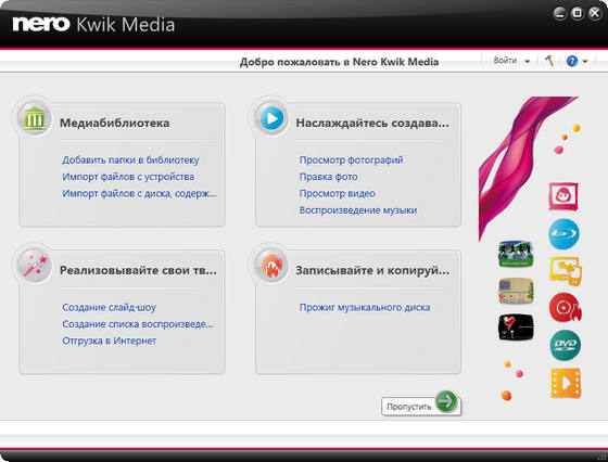 Его характеризует передовая функциональность, благодаря которой наслаждаться цифровым мультимедиа так просто. Этот простой в использовании, но мощный набор мультимедиа дает вам свободу создавать, считывать, копировать, записывать, редактировать, совместно использовать и передавать данные в сети. Что бы это ни было — музыка, видео, фото или данные — наслаждайтесь ими и используйте совместно с родными и близкими когда угодно и где угодно. Ваша цифровая составляющая жизни еще никогда не была такой свободной, ощутимой и веселой, как с простым в использовании командным центром Nero StartSmart.