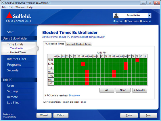 Child Control - программа ограничивает время, проводимое вашими детьми за компьютером, как только выделенное им время закончится, компьютер автоматически выключится и повторный вход будет возможен только после ввода пароля. Ограничение можно ввести как по общему времени (например, не более 1 часа в день), так и по периоду времени, когда можно работать (например, с 22:00 до 8:00 доступ запрещен). Кроме этого, программа позволяет запретить посещение нежелательных сайтов, а также заблокировать доступ к определенным дискам и папкам. Можно установить блокировку запуска тех или иных программ и внесение изменений в системный реестр. Программа ведет лог-файл всех событий.