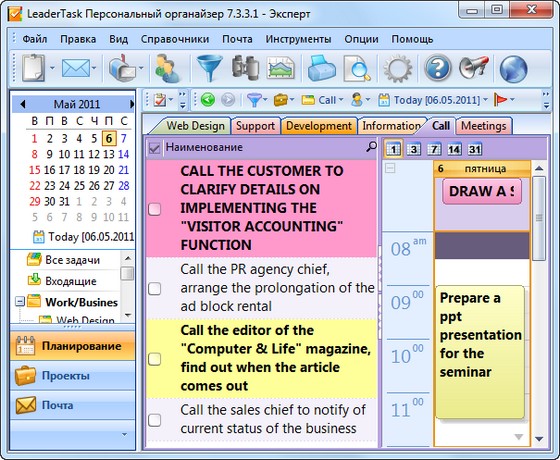 - Планирование на предприятии - планировщик LeaderTask может быть использован для управления бизнесом - организации деловых встреч, хранение бизнес контактов, составление планов реализации проектов, для планирования деятельности.