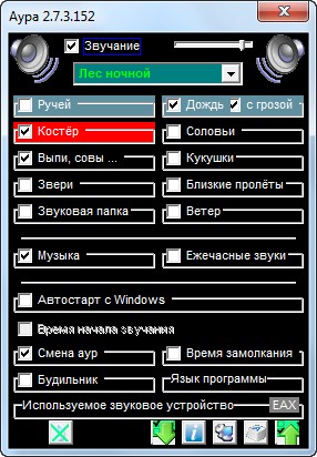 "Аура" — это программа, которая создает на вашем компьютере звуковую атмосферу дневного и ночного леса. Достаточно одного щелчка по значку, чтобы выключить или включить воспроизведение. Пульт управления, вызываемый правым кликом по значку, позволяет настроить активность птиц, цикад, ручья, водопада, дождя, грома, костра, зверей, флейты, гитары, скрипки, виолончели, назначить автоматическую смену аур (с заданной периодичностью или в соответствии с временем суток), задать автоматический старт программы при включении ПК, выбрать автоматическое выключение компьютера в заданное время (для любителей засыпать под умиротворяющие звуки леса).